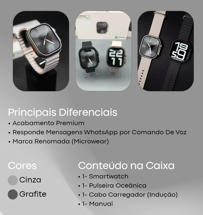 O Relógio Smartwatch Watch Ultra 3 é a escolha ideal para quem busca um relógio inteligente com tecnologia avançada, design moderno e funcionalidades completas. Perfeito para uso diário, monitoramento de saúde e atividades físicas, além de ser um produto de ótima aceitação para revenda.